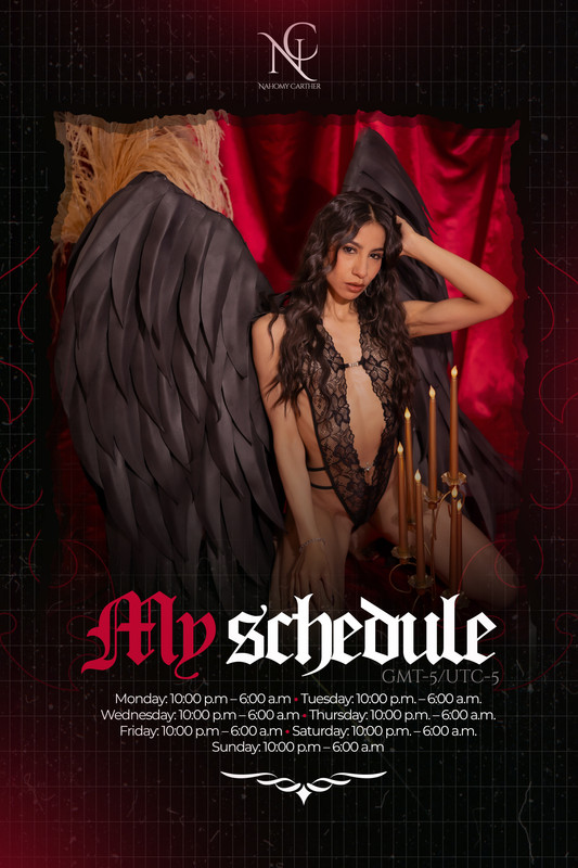 You can ASK FOR A DATE with NahomyCarther at your convenience. Everything is in your timezone, your local hours. She will receive your request and accept it if her schedule is free. You will receive a confirmation via email and you can prepare for your hot experience.