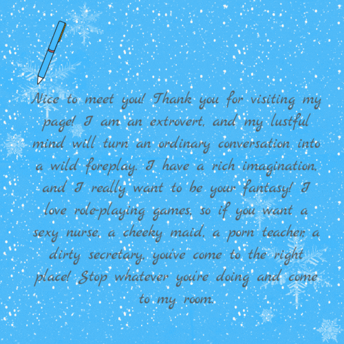 Schön, dich kennenzulernen! Danke für deinen Besuch auf meiner Seite! Ich bin extrovertiert und meine lüsterne Fantasie lässt aus einem gewöhnlichen Gespräch ein wildes Vorspiel werden. Ich habe eine blühende Fantasie und möchte deine Fantasie verkörpern! Ich liebe Rollenspiele. Wenn du also eine sexy Krankenschwester, ein freches Dienstmädchen, eine Lehrerin oder eine verruchte Sekretärin suchst, bist du hier genau richtig! Lass alles stehen und liegen und komm in mein Zimmer.